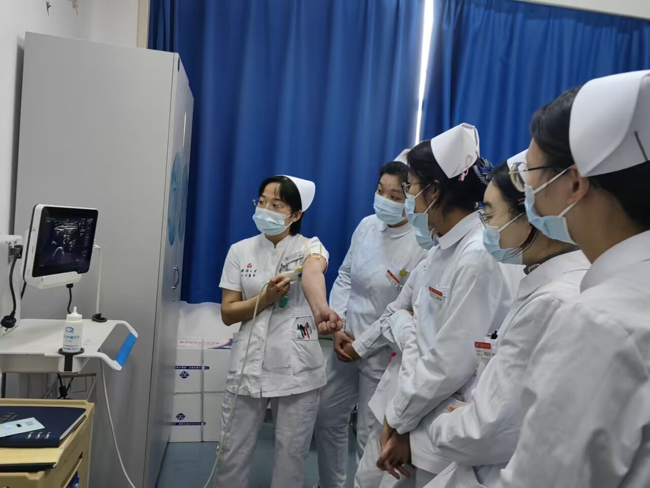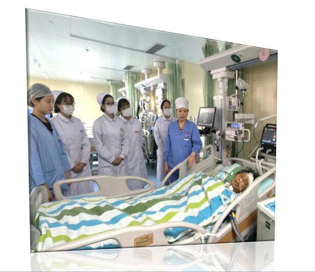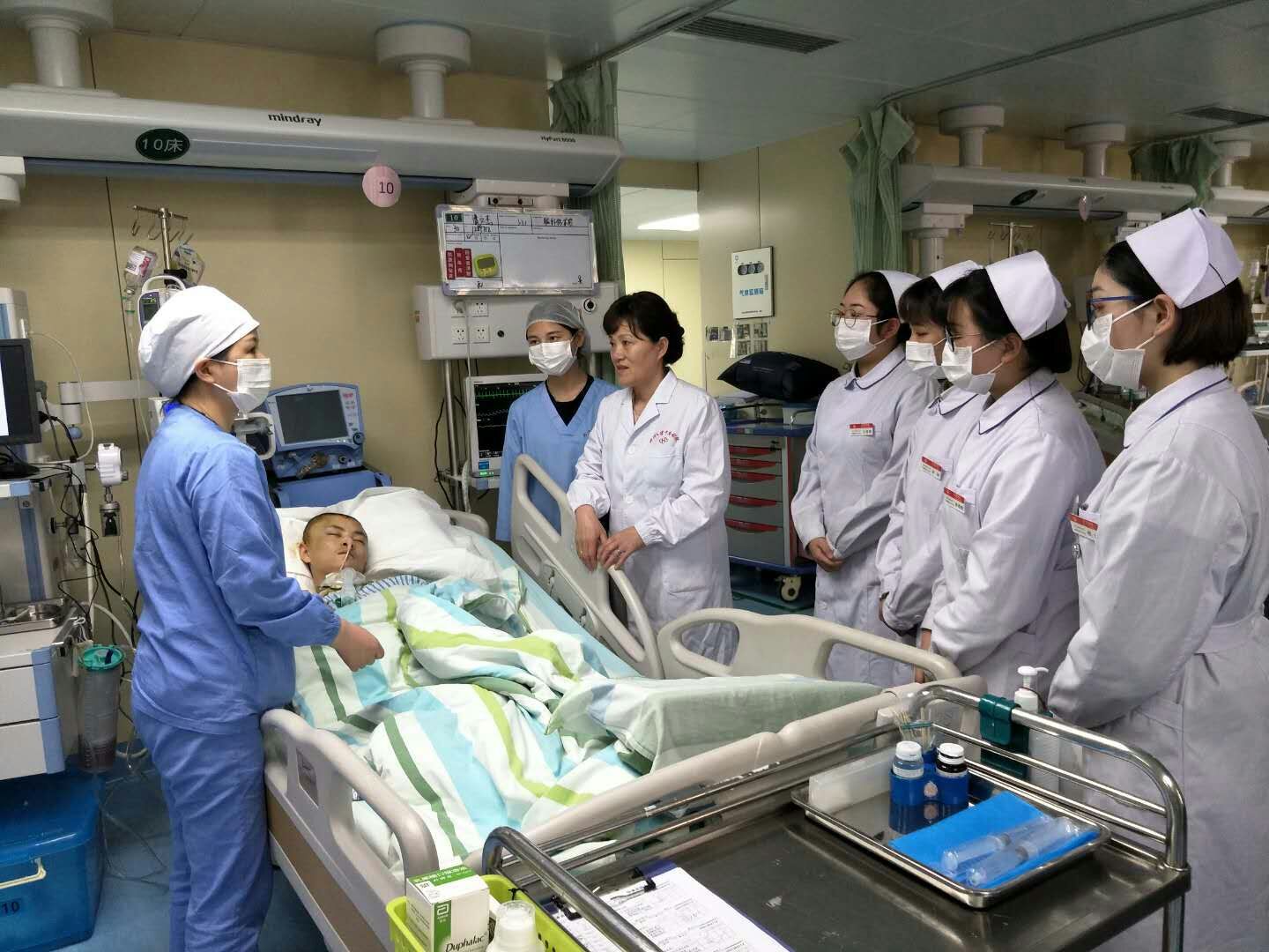危重病房教师给实习生讲解护理要点