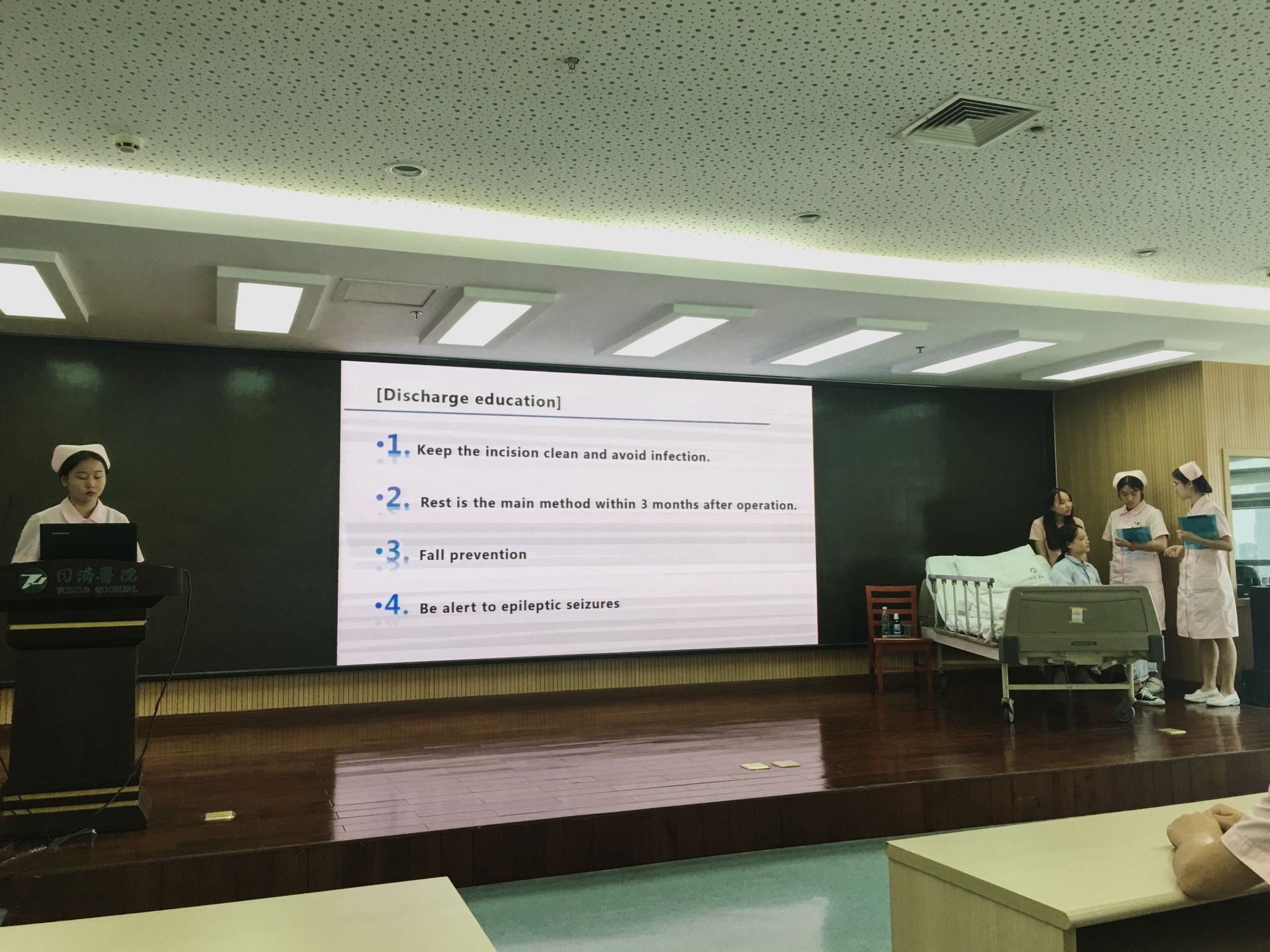 护理查房以循证护理理念为指导,全程英语介绍病情。首先,王静怡,张家齐,朱夏鑫介绍听神经瘤的定义、临床表现、检查方法、治疗方法。接着,吕琳玲同学进行患者病史介绍、入院评估和护理诊断。鲁康琳和胡婷同学对主要护理问题进行了分析解释。徐蝶同学、毛艺平同学和何珊珊同学进行了现场护理体检。经过有效治疗和护理,患者出院前郑璀同学进行了专业个性化的健康指导。流利的英语,出色的表现得到了台下全体生的认可