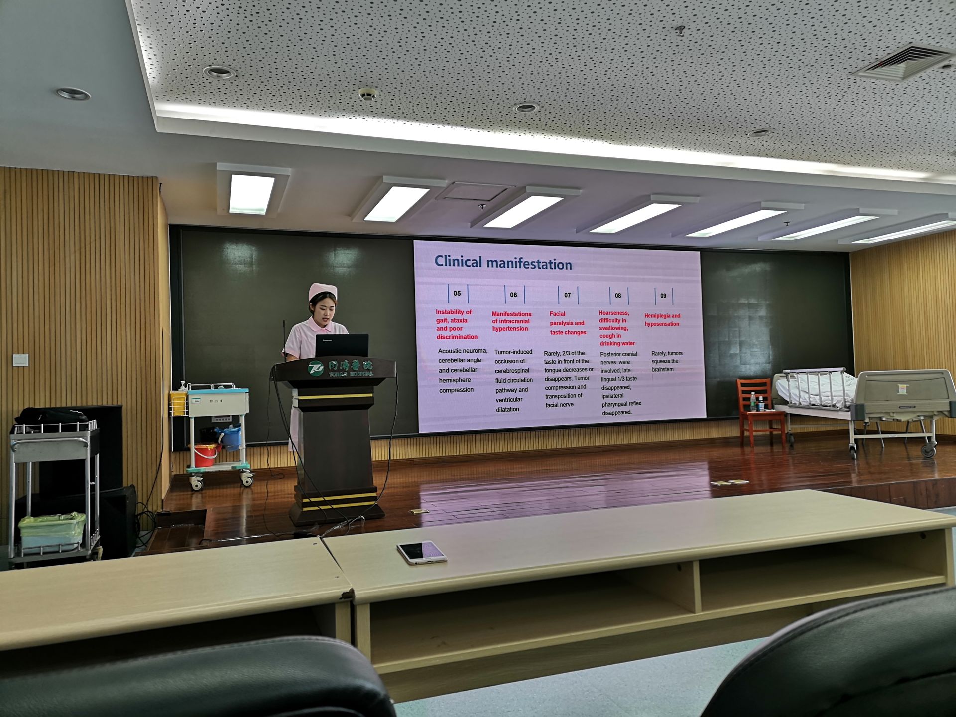 [通讯员 张家齐 杨宏英]2019年8月8日下午两点半,同济医院实习队20名学生在同济医院护理部精心组织下开展了一场别开生面的护理英语查房,护理查房内容为听神经瘤患者的护理。同济医院外科总带教组长李碧稳老师、神经外科的王婷老师及全体实习生参加。
