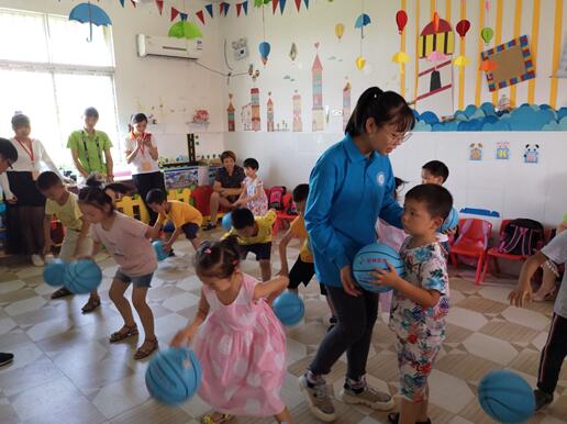 志愿者老师还以多种形式教小朋友打篮球,释放了小朋友的天性,考验了小朋友们的反应能力。经过精心准备的志愿者们教小朋友们拍篮球,小朋友们被老师们与众不同、别出心裁的上课方式吸引,课堂上一片欢声笑语。