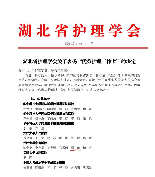 谭苗是我院高护专业2010级校友,目前就职于武汉大学中南医院感染科,被湖北省护理学会评选为“优秀护理工作者”。汪朕宇为我院护理学专业2014级校友,目前就职于华中科技大学同济医学院附属协和医院,被武汉市护理学会评选为“优秀护理工作者”。对于校友获奖,我院领导表示:“他们在坚守自己的初心和誓言,为护理事业奉献自己的青春。这就是我们的榜样,这就是榜样的力量!”