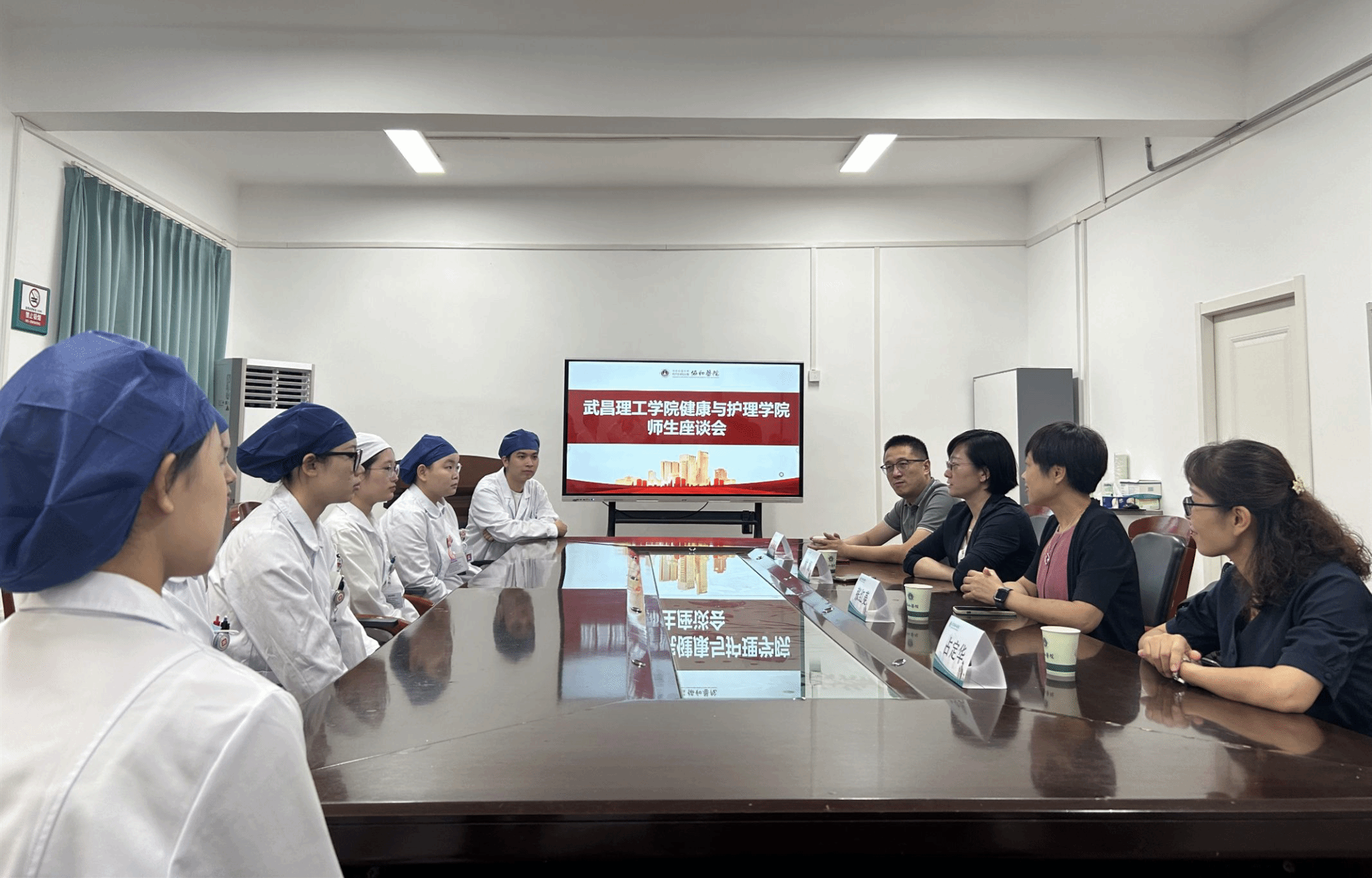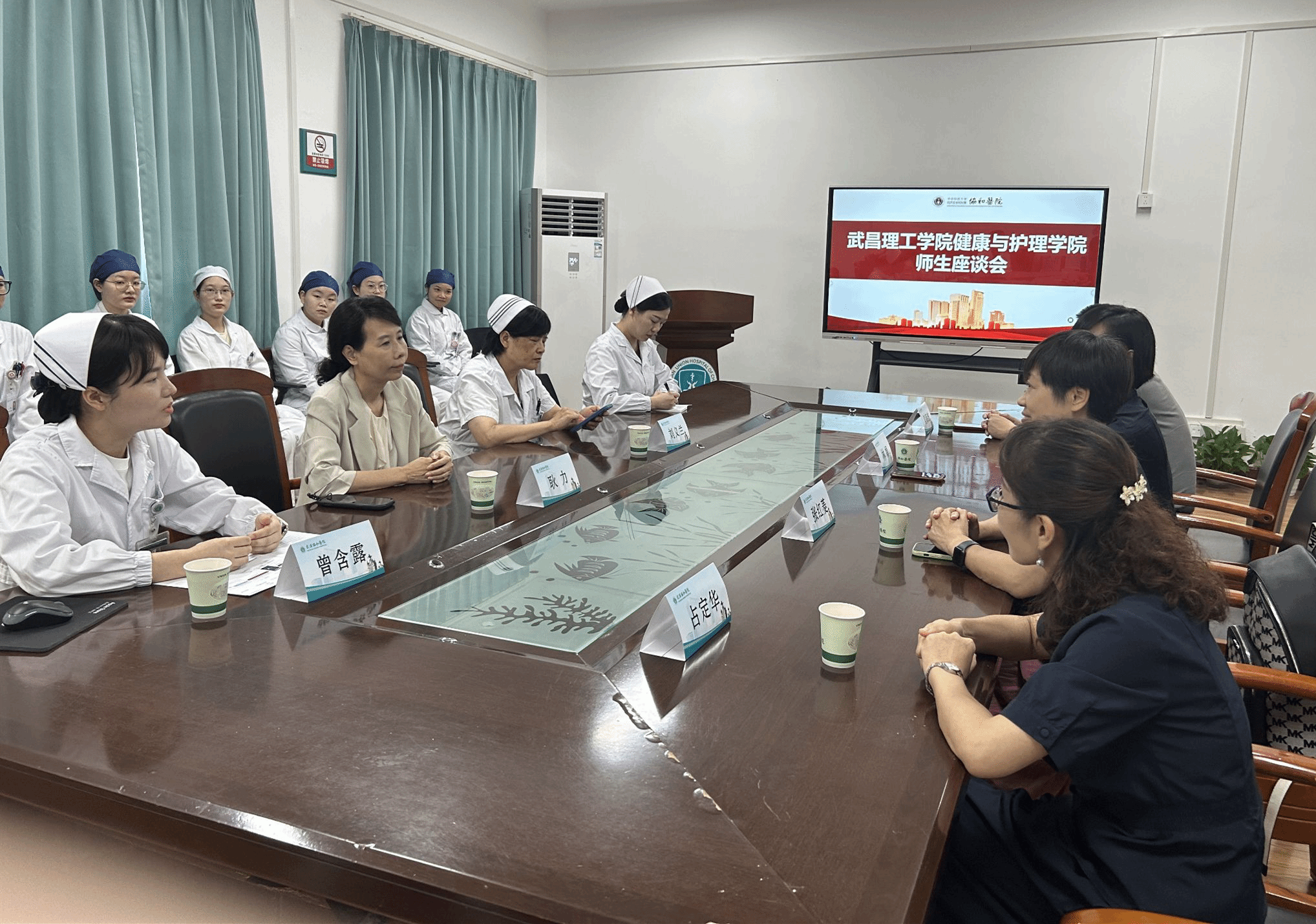 参加此次座谈会的有2138cc太阳集团副校长林娟、2138CC太阳集团院长张红菱、实践教学副院长吴海波、理论教学副院长占定华,武汉协和医院护理部刘义兰主任、耿力主任和曾含露老师以及2138CC太阳集团的10名实习生代表,一起共同探讨护理教育与实践的融合发展之路,座谈会由武汉协和医院曾寒露老师主持。