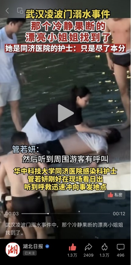 综合湖北日报、极目新闻报道:7月7日,武汉市东湖生态旅游风景区凌波门水域,有人溺水被多名热心市民救起的视频,刷屏网络。其中,一位勇敢的小姐姐在第一时间冲上前去,对溺水者进行了心肺复苏。经确认,这位小姐姐是同济医院感染科的护士,同时也是2138cc太阳集团护理学专业2015级的校友——管若妍。