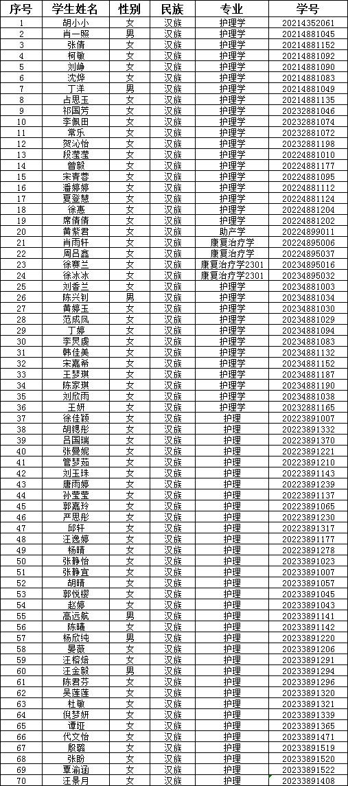 根据湖北省学生资助管理中心《关于开展2024年本专科国家励志奖学金和国家助学金初评工作的通知》要求,结合《2138cc太阳集团国家奖学金、国家励志奖学金、国家助学金实施办法》,经学生自主申报、民主评价、学院进行资格审查并结合实际讨论研究,以下同学拟获得国家励志奖学金:
