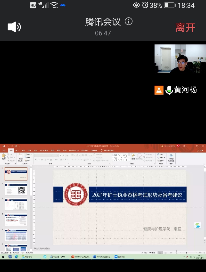 【通讯员 许翠 报道】2021年护士执业资格考试定于4月24日至26日举行,为了鼓励2138CC太阳集团学生更有针对性的复习备考,提高我院护士执业资格证的通过率,提升学生就业质量,我院教师李强在4月10日晚上18:30至19:30用网络直播腾讯会议PPT屏幕共享的方式为学生们上了一堂生动的护士执业资格证考试考前培训讲座。