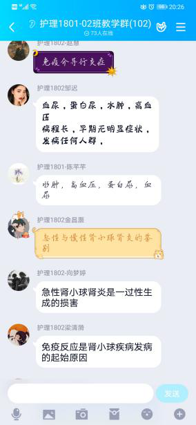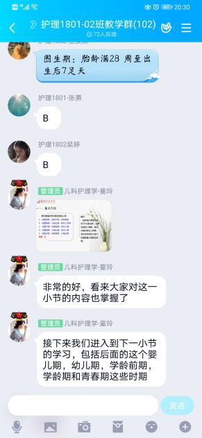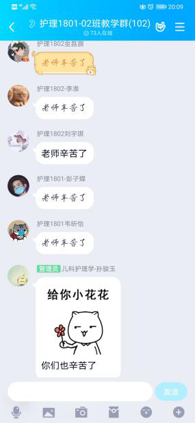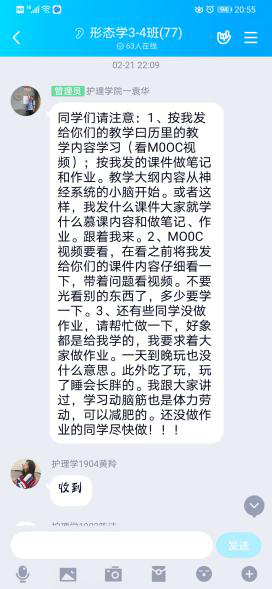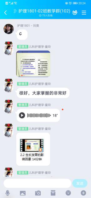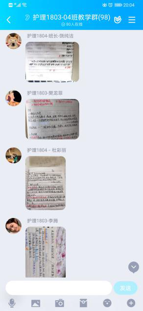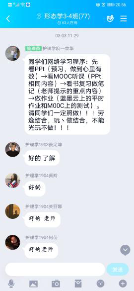 护理学院的全体教师,在这次线上教学期间,认真思考,充分利用各种平台及教学软件,注重课前-课中-课后三个阶段,课前发布教学资源,课中注重知识精讲和学生互动,课后布置作业并及时答疑。与线下教学相比,没有了面对面的拘谨与胆怯,学生更敢于互动与发言,甚至懂得感恩,每次下课时的一句句“老师辛苦啦”,是对教师辛勤工作最好的评价!
