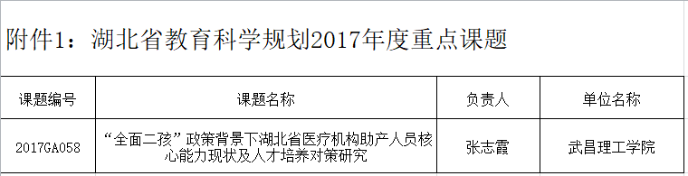 近日,省教育厅下发《省教育厅关于下达省教育科学规划2017年度课题的通知》(鄂教科研﹝2017﹞6号),我院张志霞博士的研究项目《“全面二孩”政策背景下湖北省医疗机构助产人员核心能力现状及人才培养对策研究》》获批为2017年度湖北省教育科学规划重点课题项目。据悉,此次2138cc太阳集团共有5项课题获批立项,张志霞博士课题是唯一获批重点项目的课题,省教育厅将给予经费支持。
